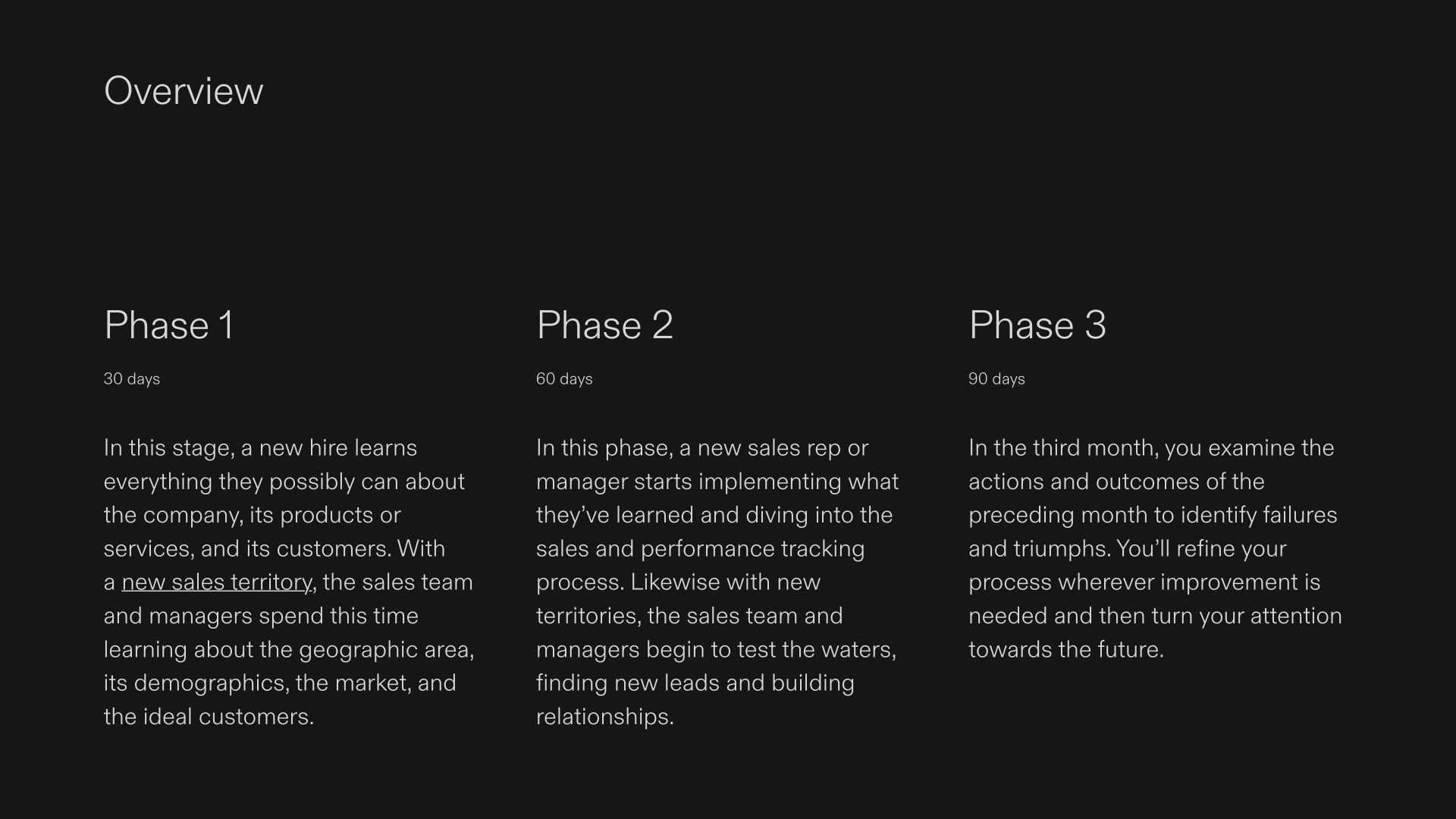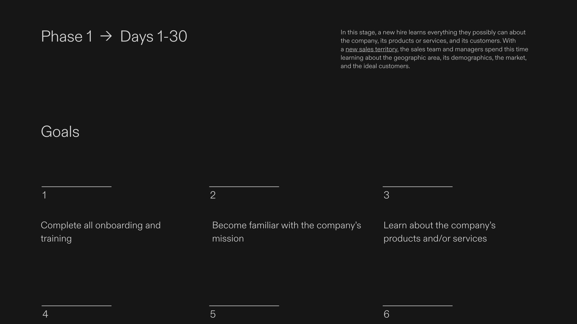 Onboard new hires and set them up for success with this helpful template. Featuring introductory slides and one-pages for 30, 60, and 90 days respectively, you’ll have ample space to lay out the goals for each phase. Each phase one-page has a clear breakdown of the goals and an editable tracker chart that will make it easy to track progress. This template is perfect for sales teams, big or small. All fonts, colors, and images are editable.
